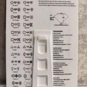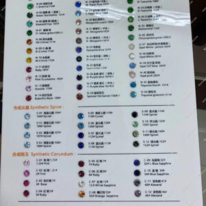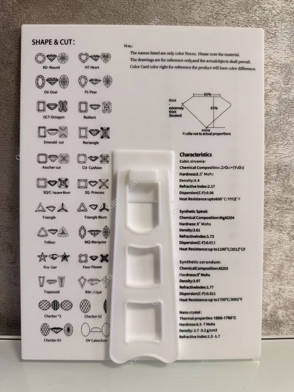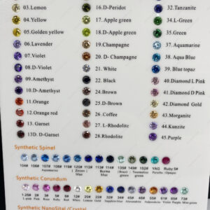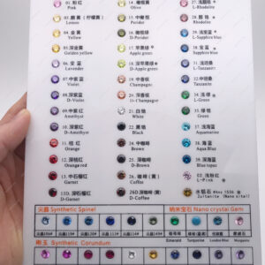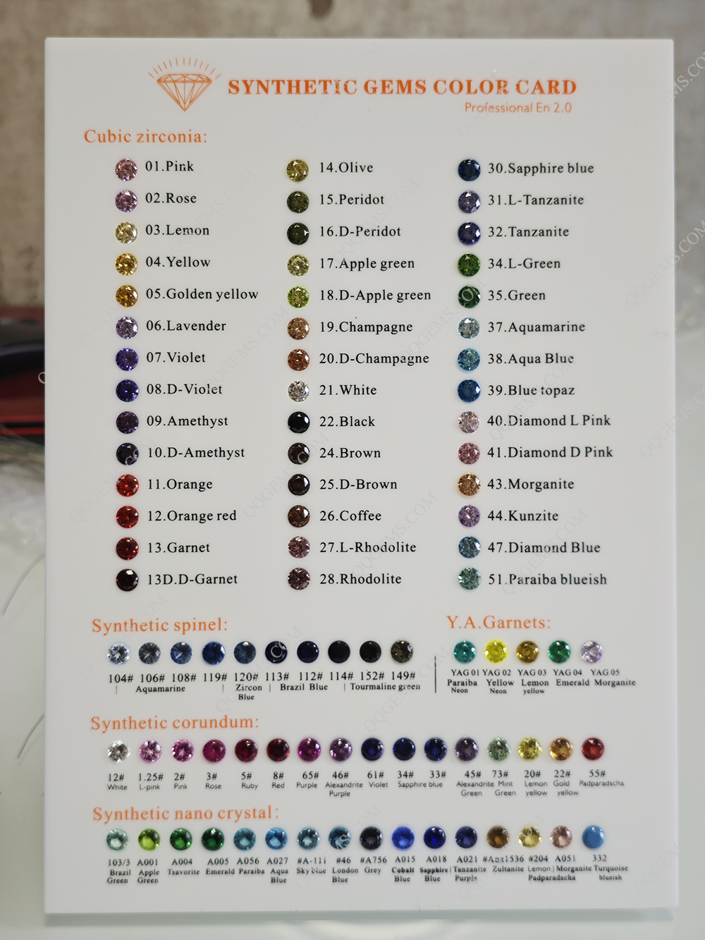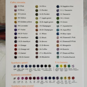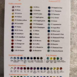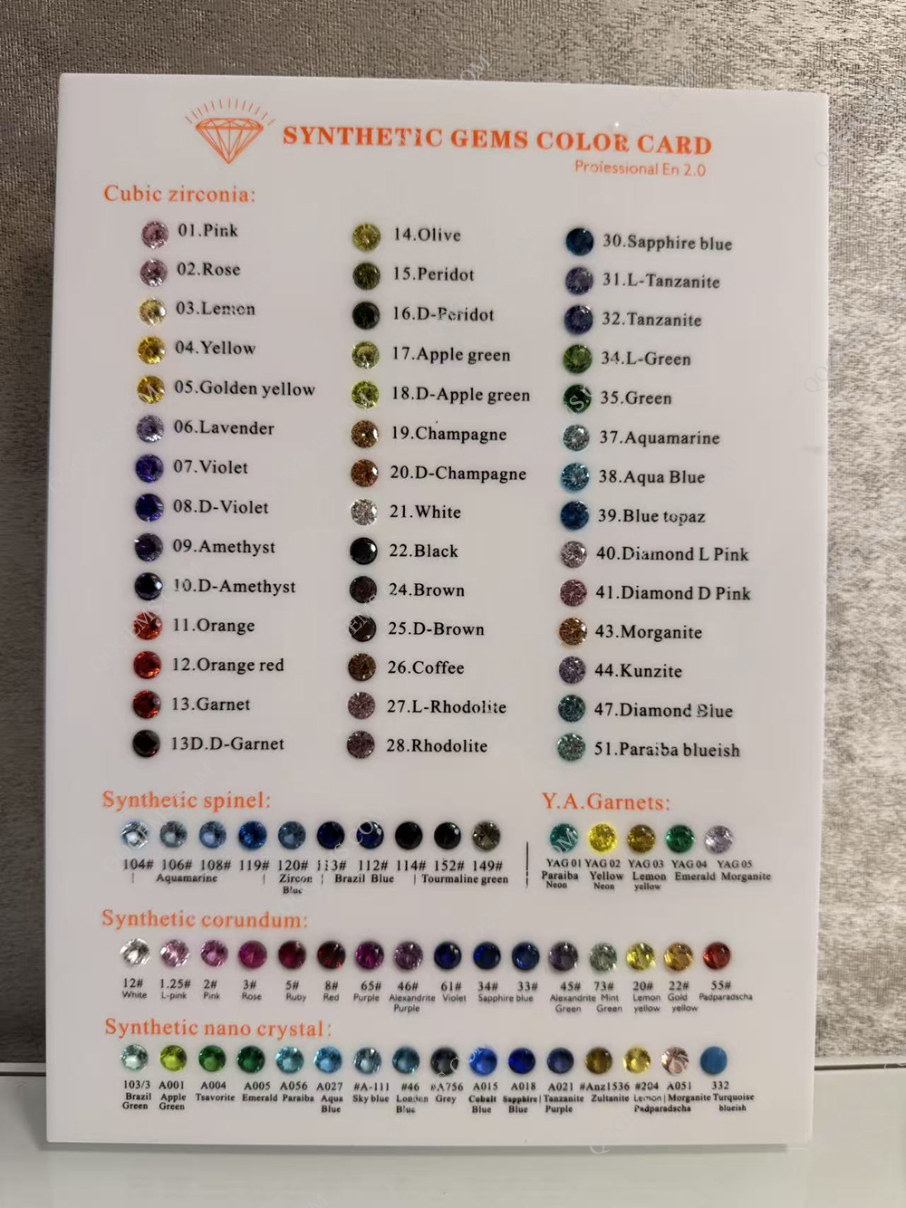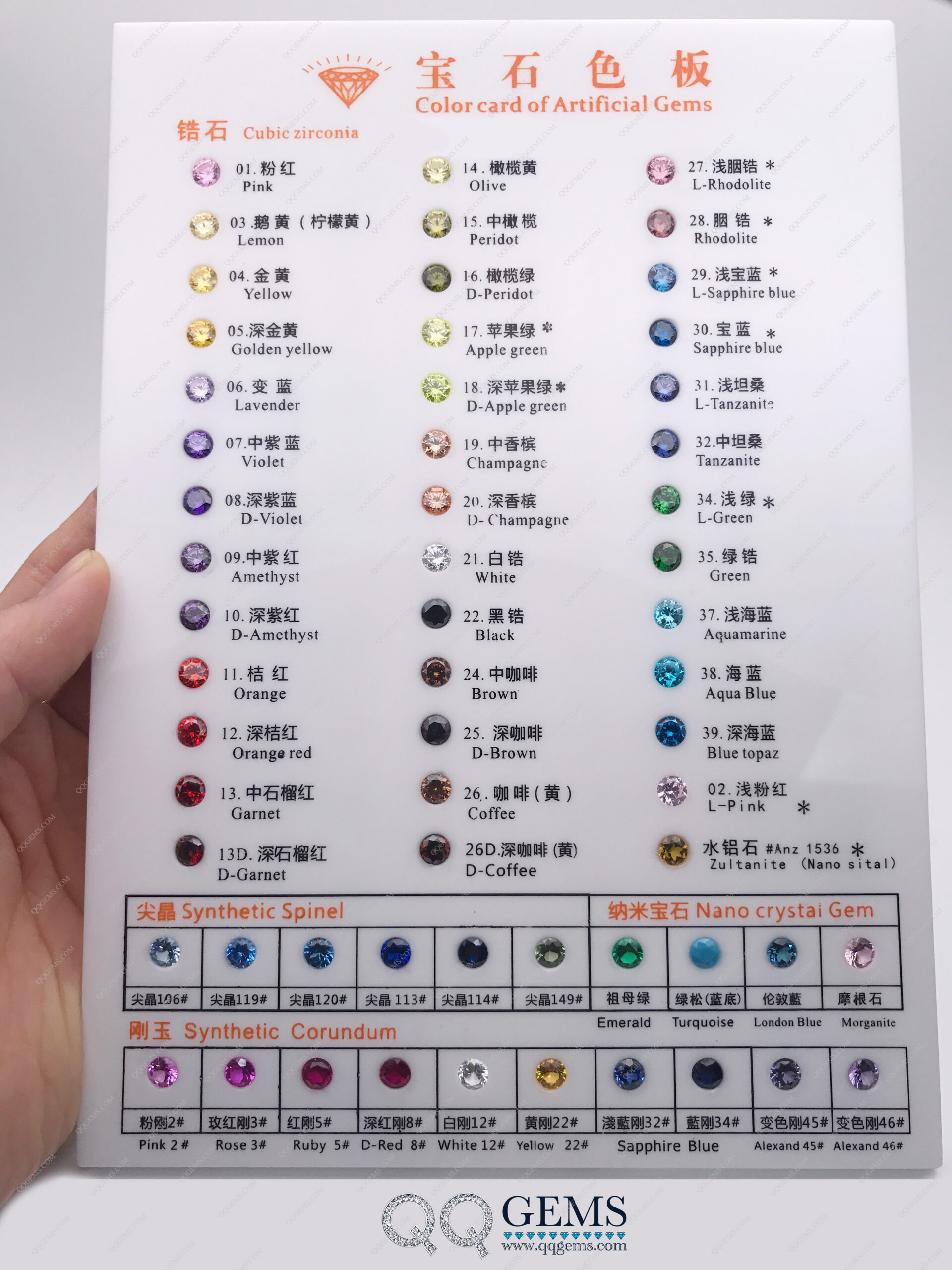 This color chart set with the Popular colors of Cubic Zirconia stones, Corundum, spinel gemstones and Nano gemstones. It's made of Acrylic, set with the real 6mm round colored Cubic zirconia gemstones in it.