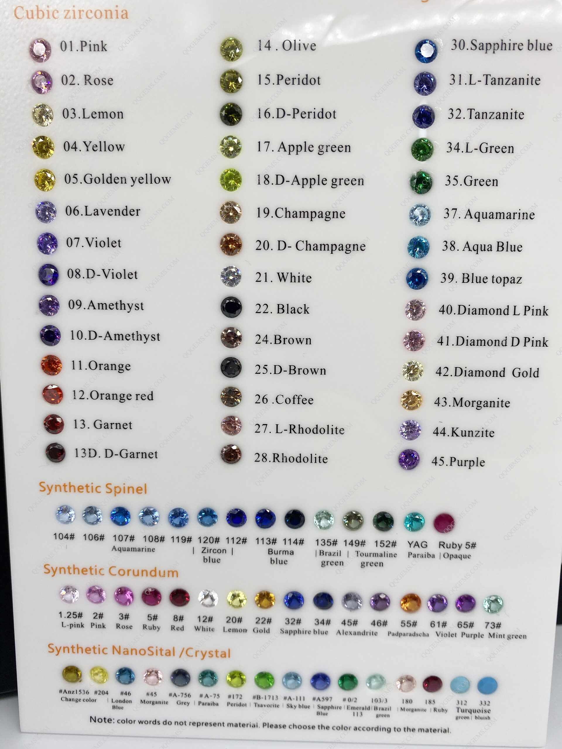 In order to make it easier for your purchase of the Cubic Zirconia gemstones, please check the pictures of the stones in the following CZ color Chart. and let us know the exact colors & color # when you're sending the enquiry/email, thanks for your cooperation.